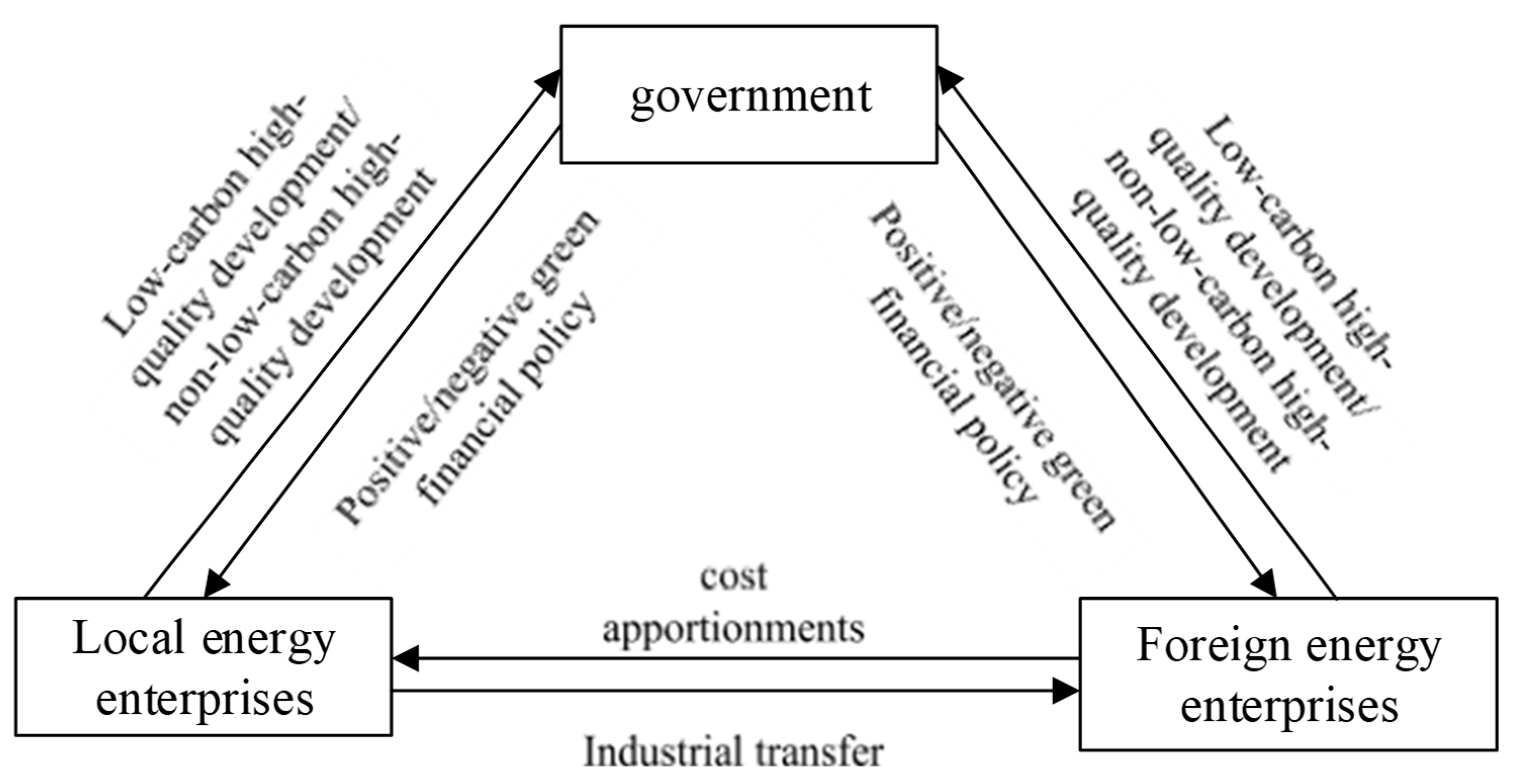 (1) It develops a tripartite evolutionary game model involving the government, local energy enterprises, and external energy enterprises. This model elucidates the micro-foundations of enterprise decision-making in response to green finance policies, specifically examining how changes in cost–benefit structures and strategic interactions facilitate low-carbon transitions.