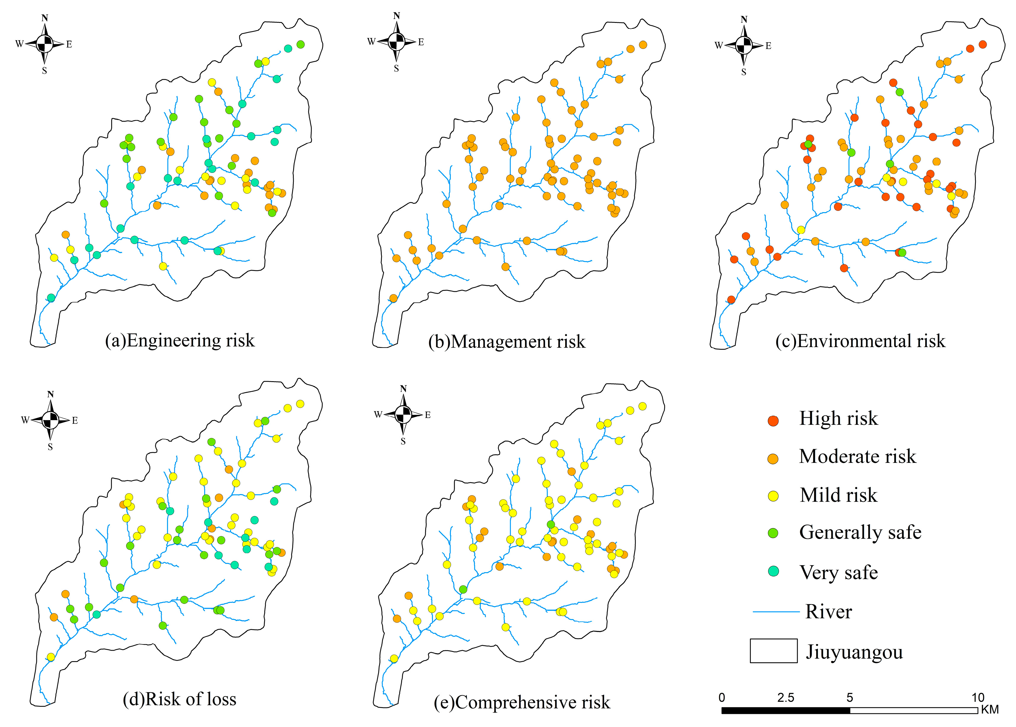 3.3. Different Risk Situations of 73 Check Dams in the Jiuyuangou Watershed