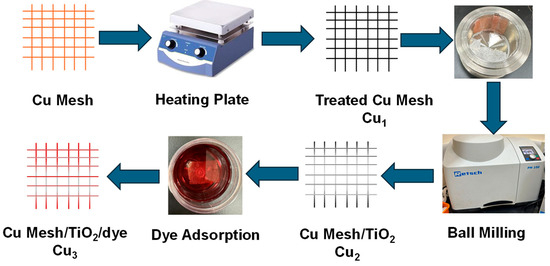 In this work, three variations of the electrodes are presented: Cu1, Cu2, and Cu3, resembling the treated Cu mesh, treated Cu mesh with TiO2 layer, and dye-sensitized/TiO2 layer Cu mesh, respectively. The preparation of the Cu mesh starts with cutting it into 5 × 5 cm pieces. The substrates are cleaned, first with ethanol and then with deionized (DI) water for a period of 15 min using an ultrasonic bath. The mesh is then rinsed, dried, and placed under UV–Ozone treatment for 30 min. Thermal treatment is then carried out to obtain copper oxide by annealing the Cu mesh substrates for 30 min at 450 °C under an open atmosphere. The deposition of the TiO2 layer on the treated Cu mesh is processed using the high-energy yet facile ball milling process. A known mass of nanoparticle-sized TiO2 powder is added to a crucible made from stainless steel with a volume of 25 mL. The Cu mesh is restricted on the edge of the crucible to ensure uniform deposition. The milling conditions are set to 450 rpm for a duration of 30 min. The ruthenium-based dye is prepared by dissolving a known amount of ruthenium into a certain volume of ethanol at a ratio of 0.3mg/mL. The dye is then introduced to the substrates by adsorption, and the Cu mesh/TiO2 substrates are immersed in the dye in a container that is placed in an unilluminated and dry room for a minimum period of 24 h. Figure 1 shows the process of fabricating and preparing the electrodes.