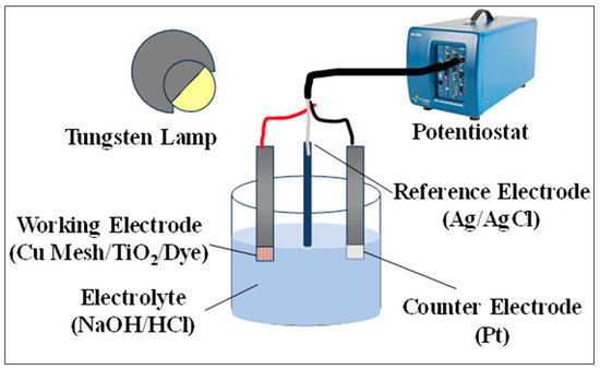 The spectral absorbance of the various electrodes is measured in the UV–Vis spectrum via a Shimadzu UV-2600iUV–Vis spectrophotometer (Kyoto, Japan). The spectra are carried using the double beam mode and utilizing air as a background reference. Chronoamperometry analysis through the Bio-Logic SP300 potentiostat (Paris, France) is utilized to study the photo response of the electrodes. A three-electrode system is used in the analysis, where the variations in the Cu mesh (Cu1, Cu2, and Cu3) act as a working electrode, a platinum (Pt) substrate acts as the counter electrode with silver/silver chloride (Ag/AgCl) saturated in potassium chloride (KCl) acting as a reference electrode. Figure 2 shows the experimental setup.