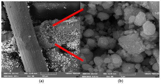 The deposition of the TiO2 nanoparticles at a microscale level is investigated using SEM, and information on the grain size and formation of the TiO2 layer are provided as well. Figure 3 shows the SEM images of the Cu mesh with TiO2 layer at various scales. The images are obtained with a beam intensity of 20 kV and magnification of 15k. The image on the right is the magnified TiO2 layer marked by the red arrows in the image of the left. Inspection of the images reveals that the TiO2 grains are tightly secured with the Cu mesh fingers, due to the sturdy, disordered arrangement of the substrate that promotes increased interaction between the surface and incoming solar radiation. Based on Gwyddion software analysis [34], the size of TiO2 grains is in the range of 3.3–4.2 μm, depending on the region and electrode. The SEM image also proves the successful deposition of the TiO2 layer on the Cu mesh. This outcome holds significance, as the strong bond between the TiO2 and the supporting Cu substrate will lead to reduced resistance in charge transfer.