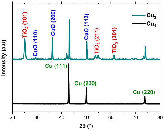 Figure 4 displays the XRD spectra of the Cu1 and Cu2 electrodes with the Cu mesh and TiO2 layer. The XRD analysis is not conducted for the Cu3 electrode as Ru-based dyes cannot be directly detected by XRD, since they are molecular complexes that adsorb as ultrathin amorphous layers on the TiO2 surface. As such, they do not produce distinct crystalline diffraction peaks that can be resolved over the much stronger TiO2 signals. The results indicate the presence of copper and its oxides, which appear due to the thermal treatment. The presented peaks are in line with data that investigate the structure of copper mesh and its oxides [35]. In addition, the Cu mesh spectrum is aligned with the Cu card (ICDD 00-004-0836) obtained from the International Center for Diffraction Data (ICDD). Moreover, the spectra show the presence of the anatase-phase TiO2 which is favorable for solar cell and photo response applications given its high stability and surface area [36]. The presented peaks are sharp and narrow in shape which indicates the presence of TiO2 particles with high crystallinity. In addition, the XRD patterns verify that there are no impurities present from the surrounding environment during both the synthesis and deposition processes.