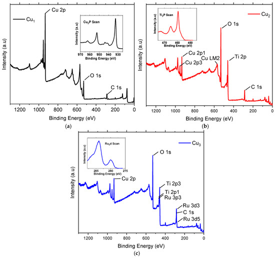 Figure 5 shows the measured XPS spectra survey of Cu1, Cu2, and Cu3 electrodes. In all cases, it is seen that the binding energy of the Cu 2p peaks is in the typical range of 932–934 eV [37]. Close inspection (inset graph in Figure 5a) reveals the presence of the characteristic doublet peaks related to Cu 2p1/2 and Cu 2p3/2 at 952 eV and 932 eV, respectively [38]. Figure 5b focuses on the XPS data of Cu2 electrodes, where peaks related to Cu 2p, Ti 2P, O 1s, and C 1s are present. Peaks related to Cu 2p are apparent because of the copper substrate and are comparable to those of Cu1 electrodes. A close up view of the Ti 2p peaks (seen in the inset of Figure 5b) shows binding energy peaks at 459 eV and 465 eV corresponding to Ti 2p3/2 and Ti 2p1/2 and are assigned to Ti4+ in TiO2 [39]. The presence of an O 1s peak in the vicinity of 530 eV is a typical representation of the Ti-O bonds on TiO2 [40]. These peaks are also apparent in the XPS spectrum of electrodes Cu3 shown in Figure 5c. In addition, inset of Figure 5c shows peaks corresponding to Ru 3d5/2 and Ru 3d3/2 and they are apparent at the binding energies of 280 eV and 284 eV, respectively. The peak around 280 eV can be assigned to the Ru0 metallic atom [41]. In all cases, the C 1s peak implies the presence of impurities and ambient contamination that are adsorbed on the electrodes.