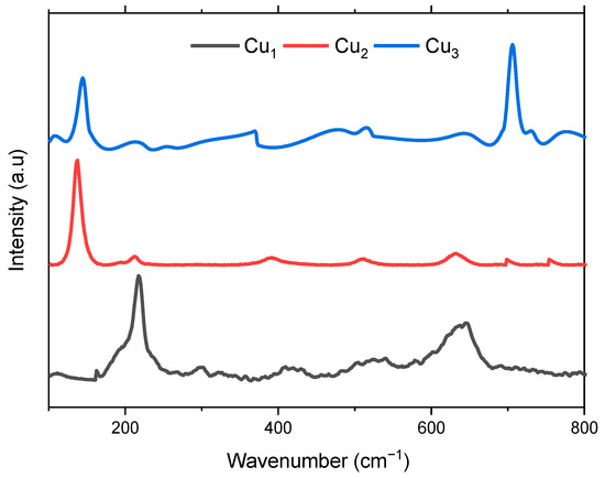The Raman spectrum depicted in Figure 6 distinctly manifests characteristic attributes of TiO2 anatase, with discernible peaks at 144 (Eg), 197 (Eg), 399 (B1g), 513 (A1g), 519 (B1g), and 639 cm−1 (Eg). Thus, it can be proven that the high-purity anatase phase of TiO2 is attained via the ball milling method. The same peaks can be observed in the spectrum regarding the Cu3 electrode. Moreover, a peak around 700 cm−1 signaling the presence of the Ru-based sensitizing dye is observed [44]. In both Cu2 and Cu3 spectra, the peaks corresponding to the copper oxide are still present, yet they have diminished in amplitude, implying uniform and even deposition of the TiO2 layer over the Cu mesh substrate [37].