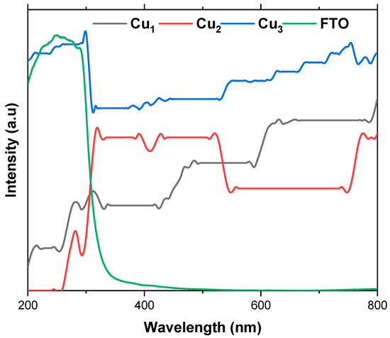 UV–Vis absorption spectra of the Cu mesh (Cu1), Cu mesh and TiO2 layer (Cu2), Cu mesh with TiO2 layer and Ru dye loading (Cu3), and FTO.