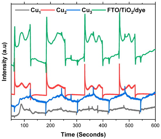 The photoelectric response of the electrodes is studied through chronoamperometry by applying a light source at various time intervals. Figure 8 shows the photocurrent response of the Cu1, Cu2, and Cu3 electrodes, in addition to the conventional FTo/TiO2/Ru dye electrode. Cu1 electrodes show adequate photo response as the Cu mesh is thermally annealed, and a semiconducting oxide is formed. Nevertheless, the addition of the TiO2 layer (Cu2 electrodes) greatly enhances the photocurrent of the Cu mesh electrodes and the photo response rate. This increase is a result of the improved charge separation and transport, which is seen with the addition of the TiO2 that has a wider bandgap than the Cu mesh oxide. Moreover, the introduction of Ru-based dye aids in the increase in the photocurrent and photo response of the electrodes. The utilization of the dye improves the electron injection rate, as the excited state of the ruthenium dye allows electrons to easily inject into the conduction band of the TiO2 layer. This accelerates the charge separation process, leading to a higher photo response rate. Furthermore, by efficiently injecting electrons, the ruthenium dye helps to minimize the recombination of charge carriers, which occurs when electrons and holes recombine rather than contribute to the current. In comparison, the FTO/TiO2/dye electrode delivers the largest, most reproducible on/off signals with sharp rise spikes followed by high, stable plateaus, reflecting fast injection from the dye, efficient percolation of electrons through the TiO2 network, and low-resistance collection by the FTO substrate.
