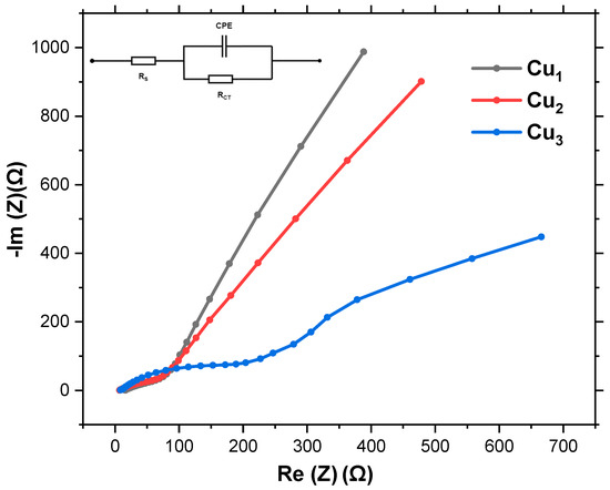 Nyquist plot for Cu mesh (Cu1), Cu mesh and TiO2 layer (Cu2), andCu mesh with TiO2 layer and Ru dye loading (Cu3).