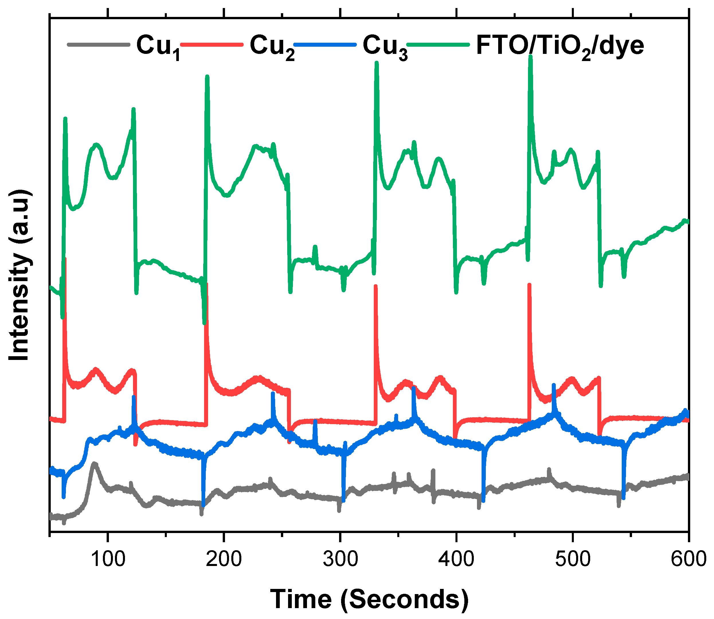 | PEC/photo response trend | Reliable baseline; moderate spikes/plateaus | Fast but lower current density vs. oxides/metals | Highest amplitude and fast transients, good injection via dye → TiO2 |