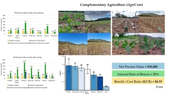 Díaz-Sánchez, F.; Cadena-Iñiguez, J.; Ruiz-Vera, V.M.; Silos-Espino, H.; Trejo-Téllez, B.I.; García-Reyes, A.; Yagüe-Blanco, J.L.; Sánchez-Escudero, J. Complementary Agriculture (AgriCom): A Low-Cost Strategy to Improve Profitability and Sustainability in Rural Communities in Semi-Arid Regions. Sustainability 2025, 17, 9481. https://doi.org/10.3390/su17219481