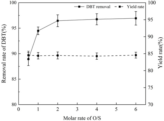Effect of Oxygen-Sulfur ratio (O/S) on desulfurization efficiency (experimental conditions: catalyst = 0.1 g, S concentration = 500 ppm, reaction time = 40 min, reaction temperature = 100 °C, solution volume = 20 mL).