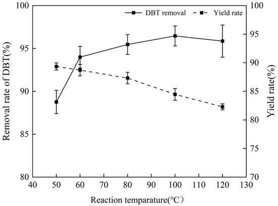 Figure 3 illustrates the effect of temperature on the elimination of DBT. The desulfurization effectiveness of Zr@AC catalytic oxidation progressively improved with increasing reaction temperatures, achieving maximal DBT elimination at 100 °C. The accelerated molecular thermal movement due to the elevated temperature enhanced the catalytic efficacy of the Zr@AC catalyst for CYHPO [35], resulting in the formation of numerous peroxy-generated groups in CYHPO, which facilitated the effective removal of DBT. Nevertheless, when the temperature was increased from 100 °C to 120 °C, the DBT removal rate decreased, likely due to the decomposition of the oxidant CYHPO at excessively high temperatures [36]. Although high temperatures undeniably enhance the rate of radical formation, the resulting paramount local concentration drastically increases the probability of intermolecular collisions. Consequently, the system favors termination pathways by which radicals undergo mutual annihilation, thereby diverting them from productive chain propagation steps with DBT. This results in a reduced oxidant quantity and consequent impact on the efficacy of the CODS reaction. Furthermore, the recovery of the simulated oil was influenced by temperature and progressively diminished as temperature increased, likely due to the reduction in viscosity and enhancement of oil fluidity resulting from the elevated temperature [37]. Based on the aforementioned experimental results, 100 °C was designated as the optimal temperature for CODS in subsequent tests.