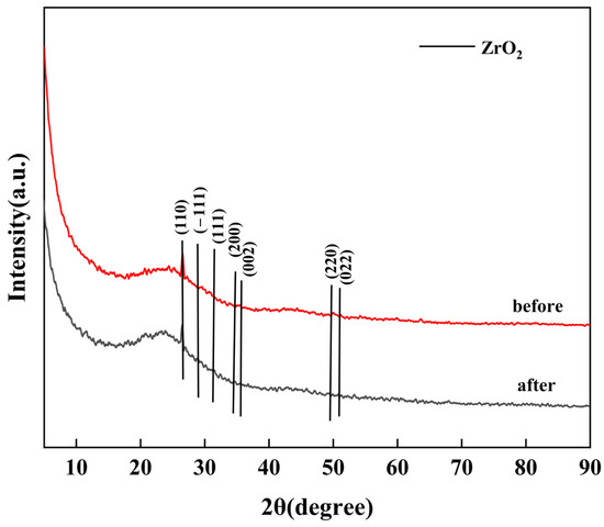 XRD examinations of Zr@AC were performed before and after the reaction to elucidate the mechanism of the catalyst action in the CODS. The findings are depicted in Figure 5. The Zr@AC sample displayed seven distinct ZrO2 peaks, at 26.94°, 29.14°, 31.22°, 34.58°, 35.76°, 49.83°, and 50.95°, which correspond to the (110), (−111), (111), (200), (002), (220), and (022) diffraction planes, respectively [30,41]. This study engineered atomic ZrO2 sites on the AC surface. Previous research has demonstrated the outstanding catalytic performance of ZrO2 [42], suggesting that the ZrO2 species in the Zr@AC catalyst likely serve as the active sites in the CODS reaction. These uniquely structured sites enhance catalytic activity, selectivity, and stability. Moreover, the XRD patterns of Zr@AC before and during the reaction exhibited substantial similarities with no appearance of new distinctive peaks. This discovery demonstrates that the structural integrity of Zr@AC is preserved throughout the catalytic process, confirming the exceptional stability of this catalyst system.