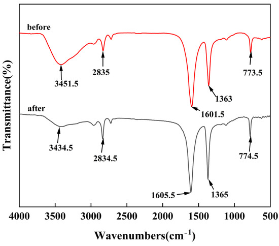 FTIR analysis was conducted on Zr@AC before and after CODS to examine the structural alterations of the catalyst (Figure 6). The distinctive absorption bands at 773.5 cm−1 and 774.5 cm−1 are attributable to the vibration modes of Zr-O [43], corroborating the XRD results. The spectrum indicates additional functional groups: broad bands at 3451.5 cm−1 and 3434.5 cm−1 (O-H stretching of adsorbed water) [44], sharp peaks at 2835 cm−1 and 2834.5 cm−1 (C-H stretching in -CH and -CH2 groups) [45], distinct absorptions at 1601.5–1605.5 cm−1 (C=C/C=O stretching vibrations) [46], and peaks at 1363–1365 cm−1 (C-OH bending vibrations) [47]. The spectral characteristics validate the existence of several active sites in Zr@AC that enable adsorption and catalytic oxidation mechanisms. The catalytic oxidative desulfurization process commences with multi-modal adsorption of DBT onto the Zr@AC surface. Initially, the DBT molecules are physisorbed onto the hydrophobic surfaces and within the pores of the AC aromatic framework via π-π interactions and van der Waals forces [48]. Subsequently, oxygen-containing functional groups on the AC surface further anchor the DBT molecules through hydrogen bonding. Concurrently, Zr4+ Lewis acid sites achieve chemisorption and pre-activation by engaging in specific coordination with the sulfur atom of DBT. Following adsorption, the neighboring Zr-O bonds efficiently activate CYHPO, generating oxygen-centered radicals that promptly oxidize the pre-concentrated DBT molecules in proximity. Throughout this process, the C=O and C-OH functional groups on the AC support significantly enhance the catalytic efficiency and long-term stability of the Zr active centers via electronic effects and synergistic interactions. Additionally, the characteristic peaks of Zr@AC exhibited noticeable perturbations, which serve as evidence that its functional groups played an active role in the adsorption mechanism. The consistent band locations before and after the reaction indicate the remarkable structural stability of the catalyst under CODS conditions.