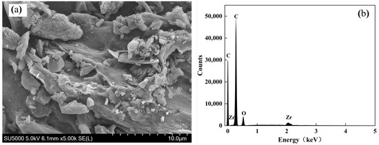 The specific surface area, pore size, and N2 isothermal adsorption–desorption curves of Zr@AC were analyzed by a specific surface area and pore size analyzer (BET, JW-BK200C, Beijing Jingwei Gao Bo Science and Technology Co., Ltd., Beijing, China). A suitable quantity of dried Zr@AC was placed in a sample tube, and scanning electron microscopy (SEM; JSM-7900F, Nippon Electron Co., Ltd., Tokyo, Japan) and the associated X-ray spectrometry (EDS) were used to examine the surface morphology and microzone composition of the materials. Physical phase analysis of the materials was conducted utilizing an X-ray diffractometer (XRD; X’Pert3 Powder, Panacor, The Netherlands) operating at a voltage of 40 kV, a current of 30 mA, and a scanning range of 2° < 2θ < 60° and interval of 0.02°. The results were analyzed using Jade 6.5 software. The surface functional groups of the materials were examined using Fourier transform infrared absorption spectrometry (FTIR; NICOLET iS10, Thermo Fisher, Waltham, MA, USA). The dried samples were ground with KBr into a powder at a mass ratio of 1:100 at room temperature and analyzed within a wavelength range of 450–4000 cm−1.