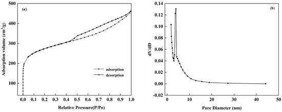 As shown in the nitrogen adsorption–desorption isotherms in Figure 8, Zr@AC belongs to the type IV nitrogen adsorption isotherm with a distinct hysteresis loop, with a maximum adsorption (desorption) capacity of 461.058 cm3/g, and an average adsorption pore diameter of 2.859 nm. The BET analysis results show that the specific surface area, the total adsorption pore volume and the total micropore volume of Zr@AC are 995.084 m2/g, 0.663 cm3/g and 0.4232 cm3/g, respectively. This indicates that the prepared Zr@AC is a microporous material and can play an important role in catalytic oxidative desulfurization by taking advantage of its own characteristics.