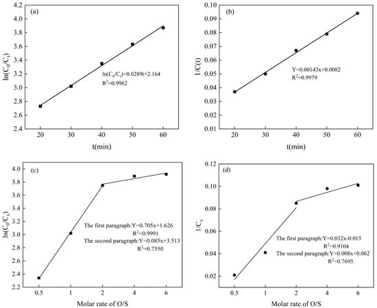 To investigate the desulfurization mechanism further, Equation (3) was employed to analyze the reaction kinetics of the catalytic oxidation process [49]: