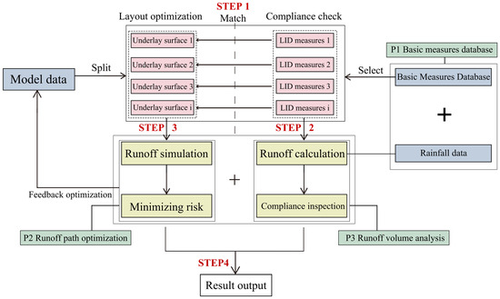 The main components of the “Sponge City+” system are divided into three parts: a basic measures database, runoff volume analysis, and runoff path optimization. The workflow is illustrated in Figure 1, and it proceeds through four steps.