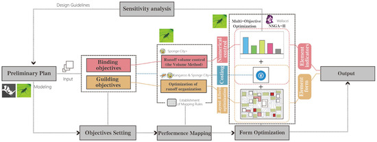 This study employs Grasshopper for Rhino as an open parametric platform to construct a collaborative framework that links urban form with hydrological performance in three stages: objectives setting, performance mapping, and form optimization (Figure 4). Rhino provides the geometric environment, while Grasshopper manages parametric data sets that directly control spatial form, enabling rapid generation and adjustment of design alternatives.