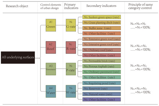 Underlying-surface data extracted by the Sponge City+ toolkit and its secondary classification. Rate, refers to the proportion associated with a particular spatial type, specifically the ratio of an indicator’s projected area to the projected area of its corresponding higher-level indicator.