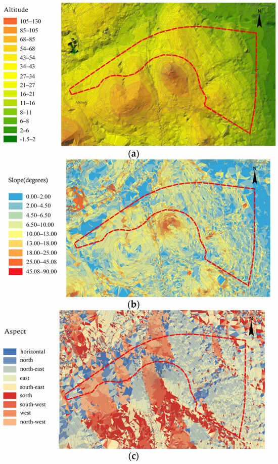Topographic data analysis of Case Study 1: (a) elevation map, (b) slope map, (c) aspect map. The red dashed line represents the boundary of the construction land.