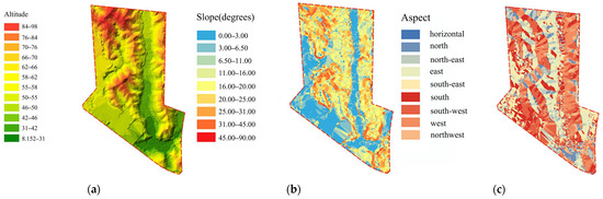 Topographic data analysis of Case Study 3: (a) elevation map, (b) slope map, (c) aspect map.