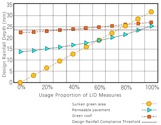 (2) Analysis of the line chart reveals that the runoff control rate attributed to sunken green spaces increases nearly proportionally with their coverage rate, indicating a balanced relationship between investment and effectiveness. Consequently, maintaining a relatively high proportion of sunken green spaces is recommended. Due to the relatively low sensitivity of green roofs to total runoff volume control, their proportion can be adjusted flexibly according to specific project requirements.
