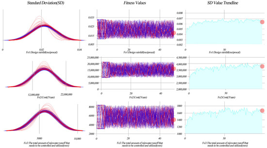 Leveraging the open-source capabilities of the Grasshopper platform, the “Sponge City+” toolkit utilizes the Wallacei plugin and the NSGA-II algorithm to achieve multi-objective optimization. During the goal-setting process for multi-objective optimization, the binding of the LID measures database with the cost database within “Sponge City+” allows cost control to be set as one of the optimization objectives. This approach helps prevent design solutions from becoming overly “performance-driven” or “idealized”. The optimization framework in this study was designed to avoid being purely performance-driven. Instead of pursuing a single “ideal” solution, the NSGA-II algorithm generated a set of feasible design alternatives that simultaneously satisfied compliance with sponge city standards (evaluated by the annual runoff volume capture ratio via the Volume Method), project cost constraints, and peak reduction targets. This ensures that all solutions meet practical thresholds and leaves the final choice to designers and stakeholders. As noted by Sun et al. (2024), effective infrastructure planning requires balancing resilience and lifecycle cost [30]. Our approach follows this rationale by embedding cost-effectiveness alongside hydrological compliance in the optimization process.
