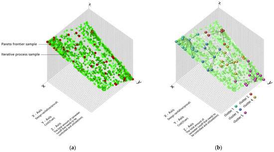 All iterative results were visualized in a three-dimensional coordinate system, as shown in Figure 11a. After 100 generations of computation, the optimization process formed a distinct Pareto Front, representing a set of relatively optimal solutions that balance the three objectives simultaneously. A further K-Means clustering analysis was performed on 50 non-dominated solutions obtained from the 100th generation (Figure 11b). By analyzing these clusters, designers can identify the representative solutions that best align with their decision-making preferences.