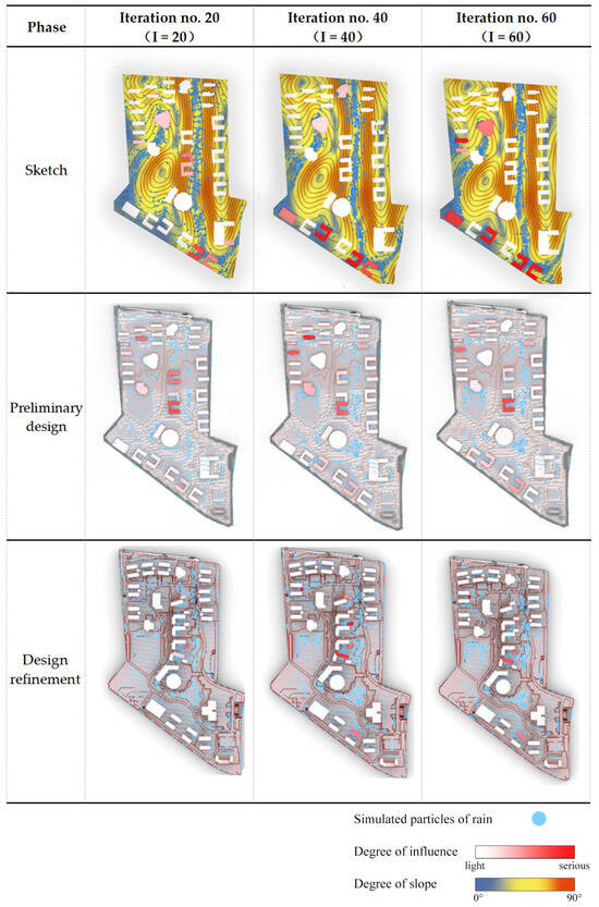 In Figure 12, the simulation results are illustrated across multiple iterations (I = 20, 40, 60) and three design phases. As the number of iterations increases, the distribution of runoff particles gradually stabilizes: early iterations highlight concentrated accumulation near low-lying buildings, while later iterations display more dispersed and realistic runoff paths. In the sketch phase, the absence of site elevation treatment caused significant conflicts between terrain and building locations, especially in the south and northwest, where buildings were exposed to runoff accumulation. In the preliminary design phase, vertical adjustments and infiltration-potential zones were introduced, reducing conflicts and leading to a more balanced distribution of runoff particles, although several central and western buildings still performed poorly. In the design refinement phase, optimization of building orientation and form, together with refined site elevation, further decreased inundation risks. Most buildings performed well in the simulation, with runoff directed to open spaces or gullies, though a few remained vulnerable. This progression demonstrates how iterative design, informed by simulation feedback, can effectively reduce building inundation risks over successive phases.