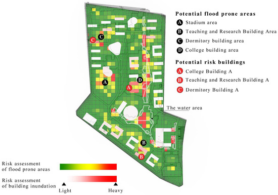 Building upon the outcomes of the previous stage, we conducted comprehensive simulations to identify flood-prone areas within the design proposal, thereby providing reference for the layout of Low-impact Development (LID) facilities. We used the Grasshopper tool to overlay two elements—risk assessment of building inundation and risk assessment of flood-prone areas—to produce the final diversity map shown in Figure 13. The analysis indicated that the highest-risk areas (marked in red) largely overlapped with existing water bodies. Nevertheless, several zones requiring improved stormwater management were identified, including the southernmost teaching and research buildings, the western stadium, and dormitory buildings in the northwest. To address these risks, a series of optimization strategies were proposed: (1) in the stadium area (Zone A), underground detention tanks or sunken green spaces could be adopted, leveraging the large open space and relatively low utilization rate; (2) in Zone B with low elevations and adjacent vulnerable buildings, the ground level could be raised slightly to guide runoff into the central water landscape; (3) in Zone C, where higher elevations cause water to accumulate near key facilities, LID measures such as infiltration systems should be deployed to ensure smooth drainage to lower areas; and (4) in Zone D, where runoff risk is intensified by its proximity to water bodies, protective measures such as elevation adjustment or physical barriers are necessary to prevent direct convergence of floodwaters. These strategies illustrate how risk analysis and LID design can be combined to refine spatial layouts, mitigate localized flooding, and enhance overall site resilience.