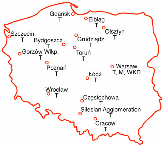 - Górnikiewicz, W. Transport tramwajowy w Polsce—Funkcjonowanie i organizacja (Tram transport in Poland—Operation and organisation). Urban Dev. Issues 2020, 66, 207–216. [Google Scholar] [CrossRef]