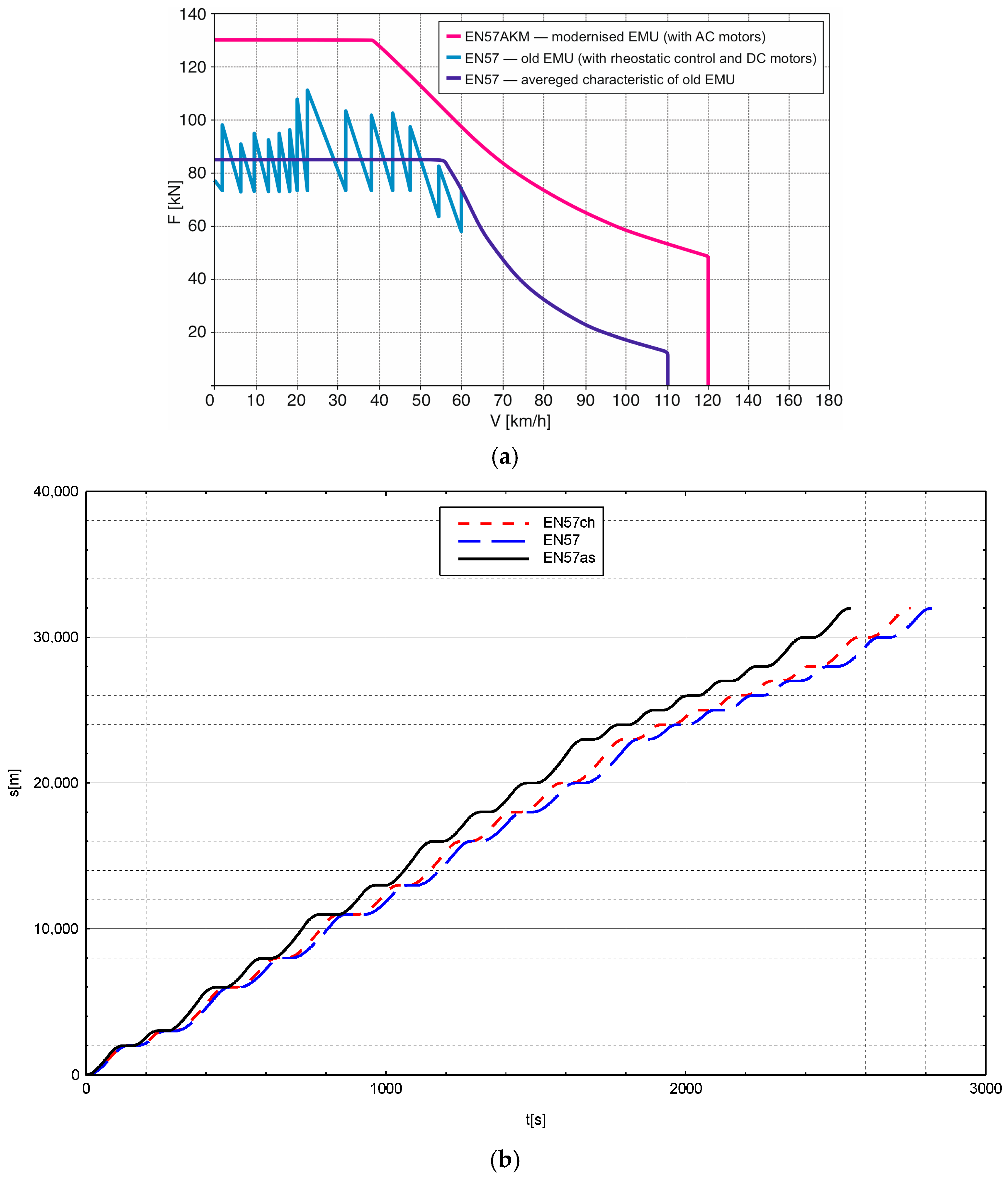 Figure 1a compares the traction characteristics of the original EN57 and the modernised EN57AKM unit.