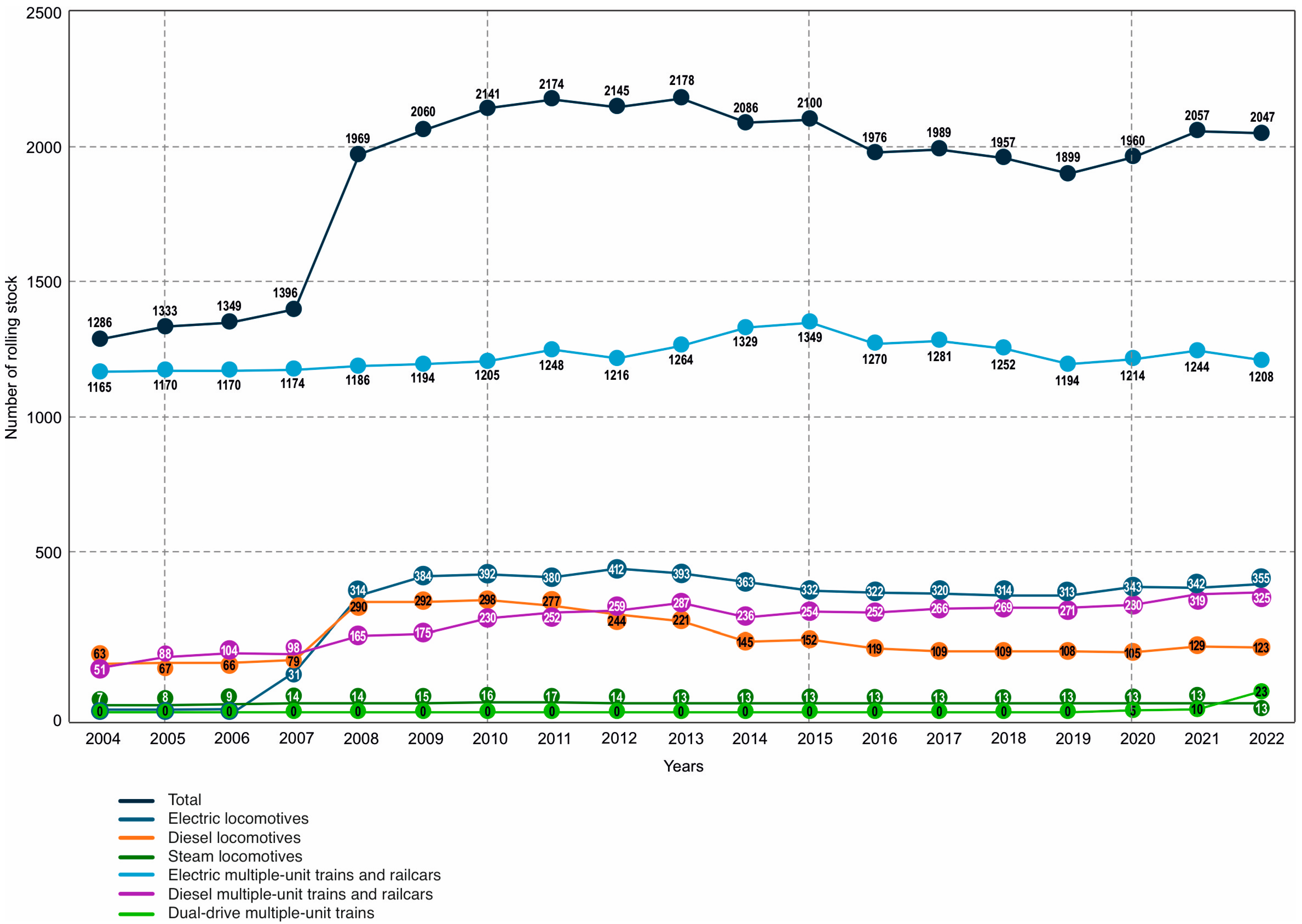 As part of the same restructuring process, PKP CARGO S.A. was also established in 2001. It inherited the property of the former Directorate of Railway Freight Traffic CARGO, which had functioned within PKP since September 1999. PKP S.A. became the founder and sole shareholder of PKP CARGO. In 2001, the company’s assets included 1763 electric locomotives (3 kV DC), 2054 diesel locomotives, 25 steam locomotives, and 90,185 freight wagons. The main types of locomotives operating in Poland in 2004 are presented in