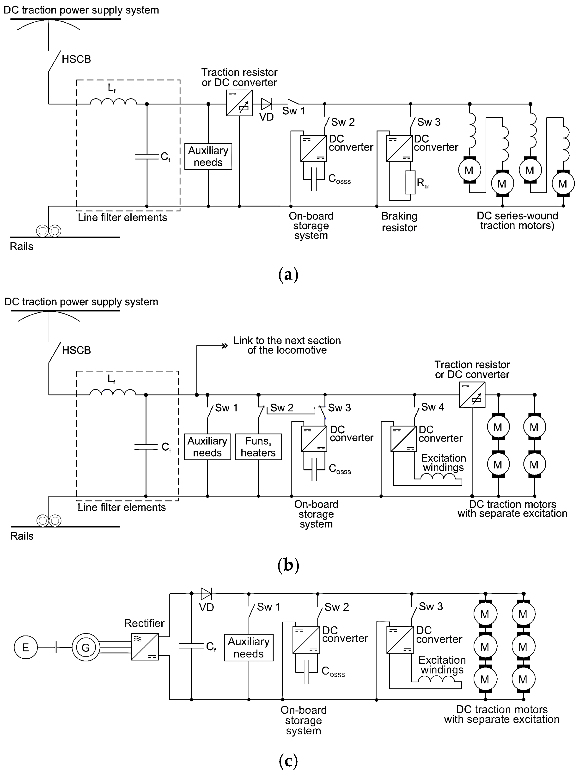 61]. The autonomy of the RBM from the catenary system allows recovered energy to be retained within the vehicle, preventing its backflow into the power supply network. Moreover, the phase correlation between RBM and traction modes enables the optimisation of OSSS capacity and reduction in its mass–volume indices, particularly for multiple-unit trains, trams, and diesel locomotives, as shown in