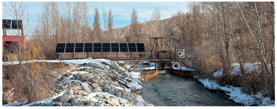 Test bed of the hybrid small-hydropower–photovoltaic (SHP–PV) system at the Baltik canal, Bishkek, Kyrgyz Republic (42°46′28″ N, 74°34′59″ E). The photo shows the canal reach used to parameterize the annual-energy model in Section 2.2, including the PV string mounted on a walkway, the hydraulic retrofit platform for the SHP intake, and the air-side heat-recovery unit (fan coil) for greenhouse heating. Typical bulk velocities are ≈2 m s−1 (winter) and ≈3–4 m s−1 (summer); nominal plant sizes are 10 MW (SHP) and 2 MW (PV).