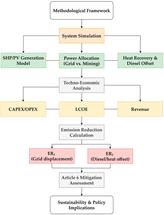This lack of integrative analyses represents a critical barrier to scaling, as developers and policymakers lack evidence-based guidance on techno-economic feasibility, mitigation accounting, and co-benefits in decentralized renewable systems. Addressing this gap, the present study provides a comprehensive techno-economic and mitigation assessment of a 10 MW SHP–PV hybrid configuration in the Bishkek canal corridor, explicitly incorporating flexible mining loads, waste-heat utilization, and Article 6 readiness. Building on prior work that integrates mining loads with renewables and greenhouse heat reuse, we extend the analysis to an SHP–PV–mining–greenhouse system tailored to the Kyrgyz context [13,15]. Within this system, Bitcoin mining is introduced as a flexible demand sink, and nearly all of its consumed electricity is converted into low-grade heat, which is subsequently recovered for greenhouse heating. A 50 m2 demonstration-scale greenhouse is employed to couple annual power allocation, techno-economic cash-flow analysis, and emission-reduction accounting consistent with Article 6 methodologies. Crucially, the framework ensures methodological rigor by preventing double counting: mitigation benefits are attributed solely to grid-displacing electricity and diesel heating substitution, whereas electricity consumed directly by mining is excluded from crediting [19,20,21,22].