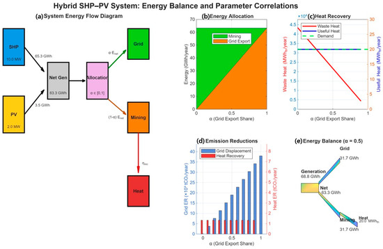 Operational resolution note. Equation (4) defines the annual accounting identities used for reporting. To characterize intra-annual dynamics without site-level hourly measurements, we also employ a profile-based hourly guide (Δt = 1 h) in which the allocation becomes α(t) and the mining operation is constrained by ramp-rate limits, minimum stable power, and restart dead-time. Figure A1 and Section 4.3 summarize temporal-matching (heat coverage) and loss metrics (heat spillage, electrical curtailment). Annual allocations in Table 1 are unchanged. For clarity, Table 1 lists the key symbols and baseline values under a consistent SI unit system and hourly time step; scenario-specific settings and implementation details are provided in Section 2.2.2 and Section 2.2.3.