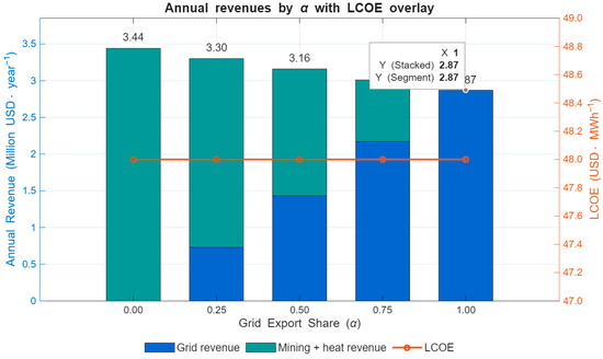 For each scenario α ∈ {0, 0.25, 0.50, 0.75, 1}, the ASIC fleet size is endogenously set such that its annual electrical consumption matches Emine within ±1%. The exported electricity Eexport is subsequently used for grid-connected mitigation accounting (Section 2.5), while Emine becomes the heat source for air-side heat recovery to the greenhouse (Section 2.3). The scenario set thus spans fully off-grid flexible use (α = 0) to fully merchant operation (α = 1), enabling a transparent comparison of techno-economic and mitigation outcomes grounded in the site’s planning baselines.
