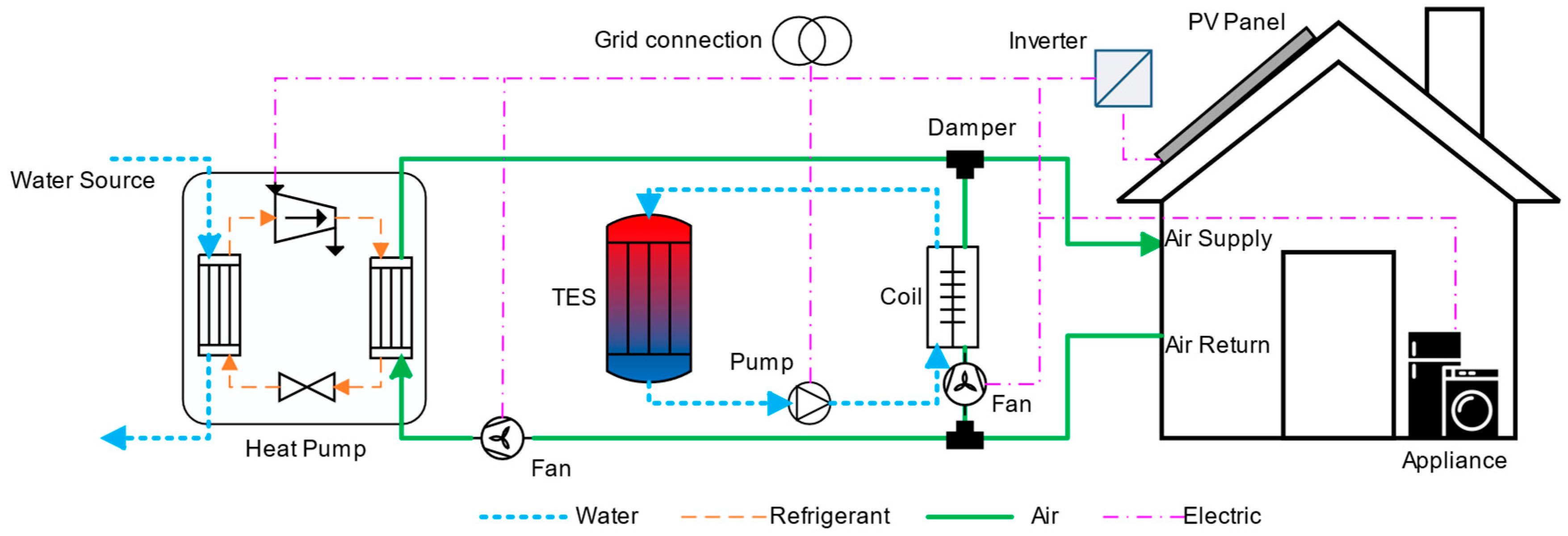 Both systems are modeled for integration with a conventional residential air-based HVAC system. Dynamic inputs for the analysis, including building loads, weather data, and PV power availability, form the basis for evaluating the performance of each storage strategy.