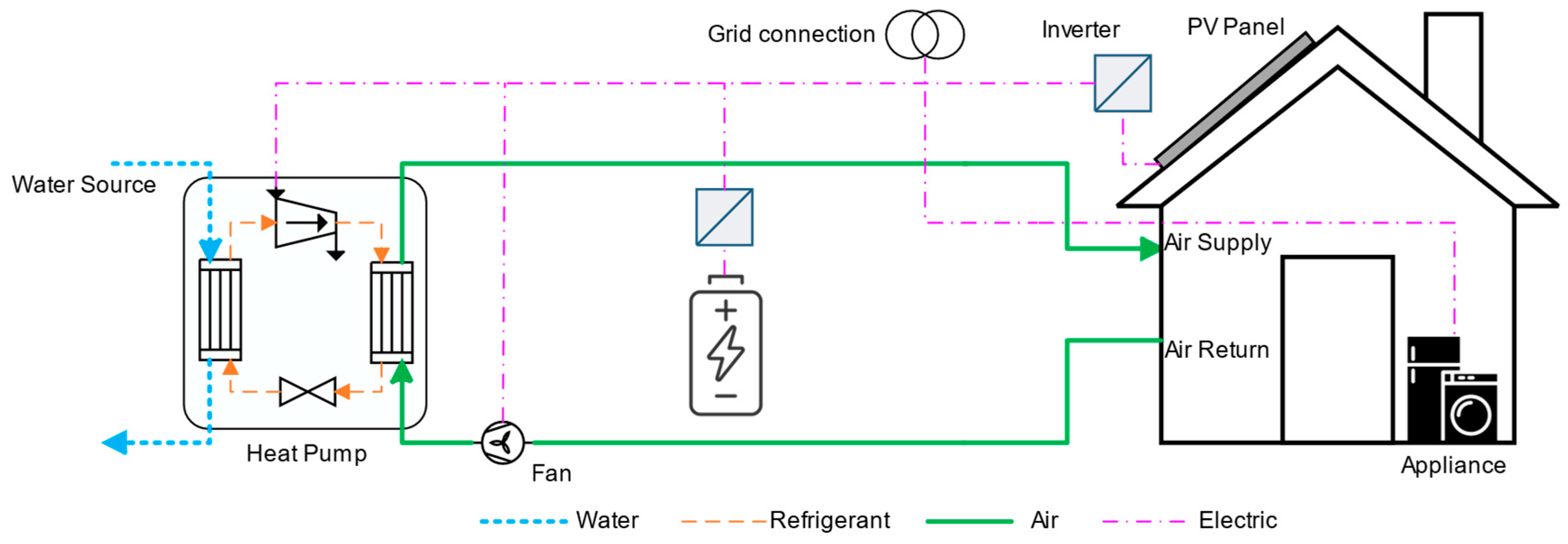 Figure 2. Schematic of the PV-HP-BESS system integration in residential buildings. Green solid, blue dashed, and purple dotted lines denote airflow, water flow, and power flow, respectively.