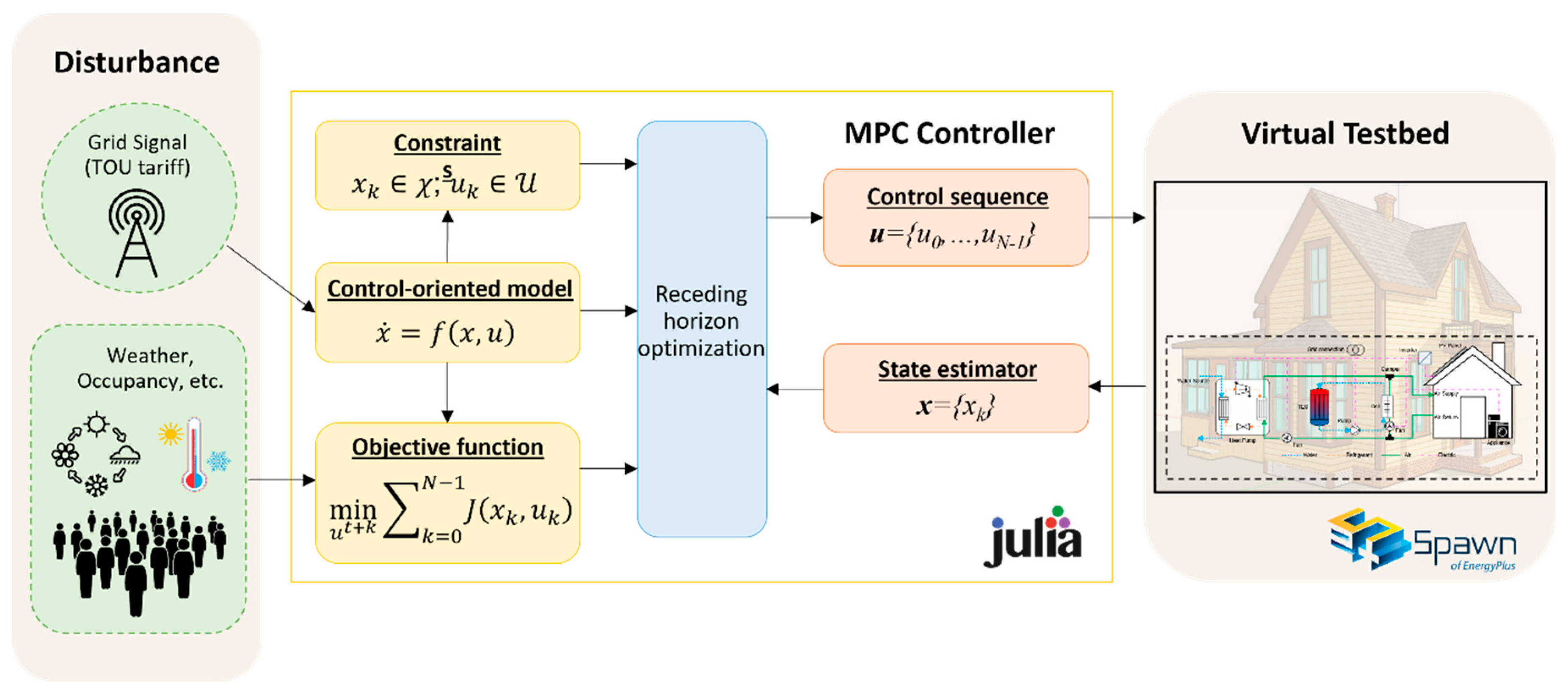 Figure 3. Schematic diagram of the proposed MPC-centric optimization framework, which integrates Julia for optimization modeling and Spawn of the EnergyPlus co-simulation framework for a high-fidelity virtual testbed.