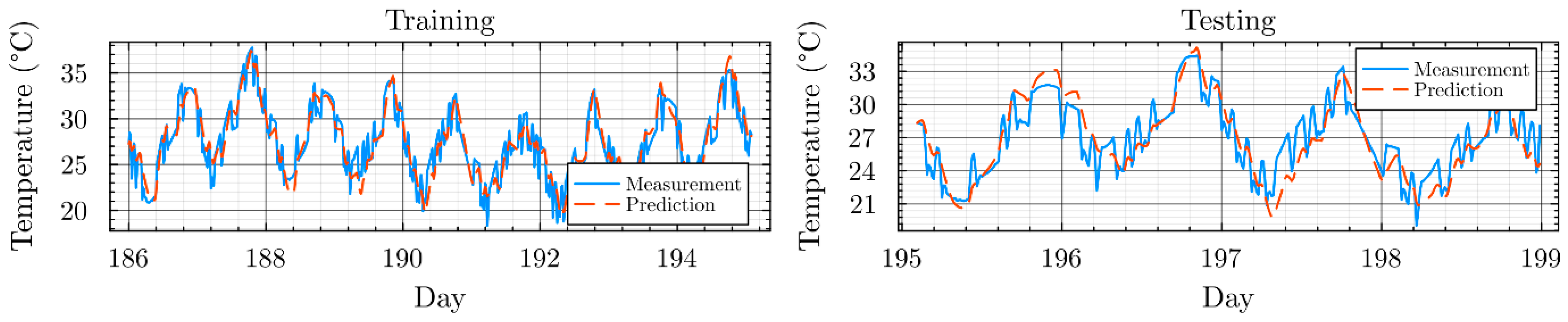 These parameters were identified using a data driven methodology. Simulation data was generated using an EnergyPlus model of the U.S. Department of Energy (DOE) prototype single family home configured for Atlanta, GA [34]. To excite the system dynamics for robust identification, the HVAC system’s operation was modulated using a pseudo random binary sequence input signal. This procedure produced a dataset with a 15-min time resolution, which was then partitioned into separate one week sets for model training and validation. The prediction accuracy R2 and Coefficient of Variation in the Root Mean Square Error (CVRMSE) of the obtained model reached 92% and 3.9%, as shown in Figure 4.