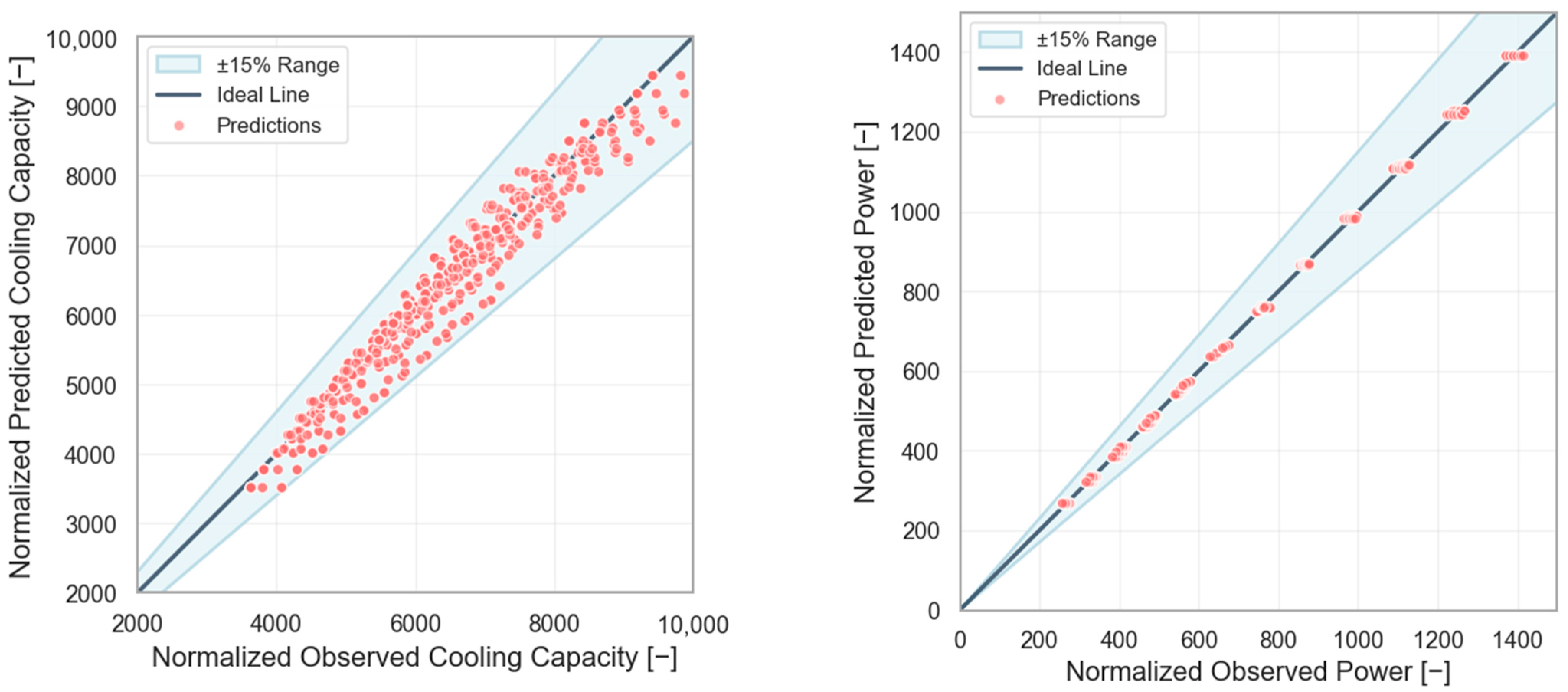 Figure 5. Fitting performance of reduced order heat pump model on cooling capacity (left) and compressor power consumption (right).