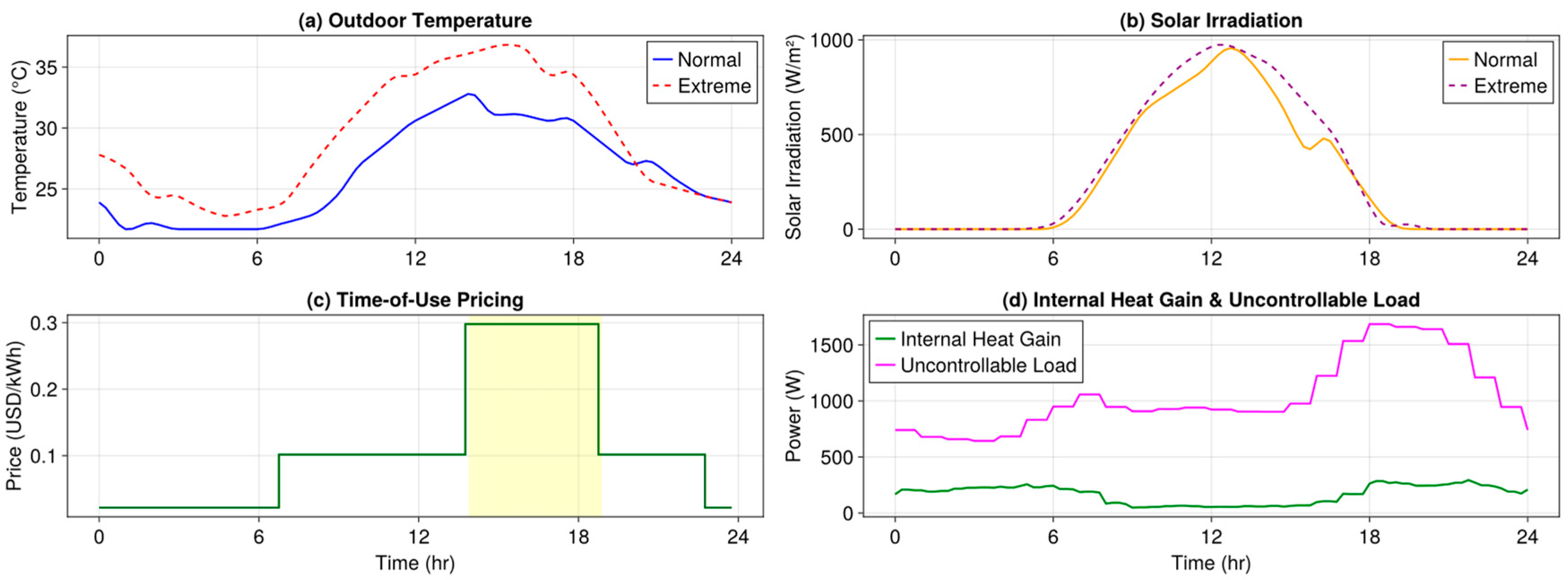 Figure 7. Exogenous inputs used in case study: (a) outdoor conditions; (b) solar irradiation; (c) TOU price; and (d) internal heat gain/uncontrollable load profiles.