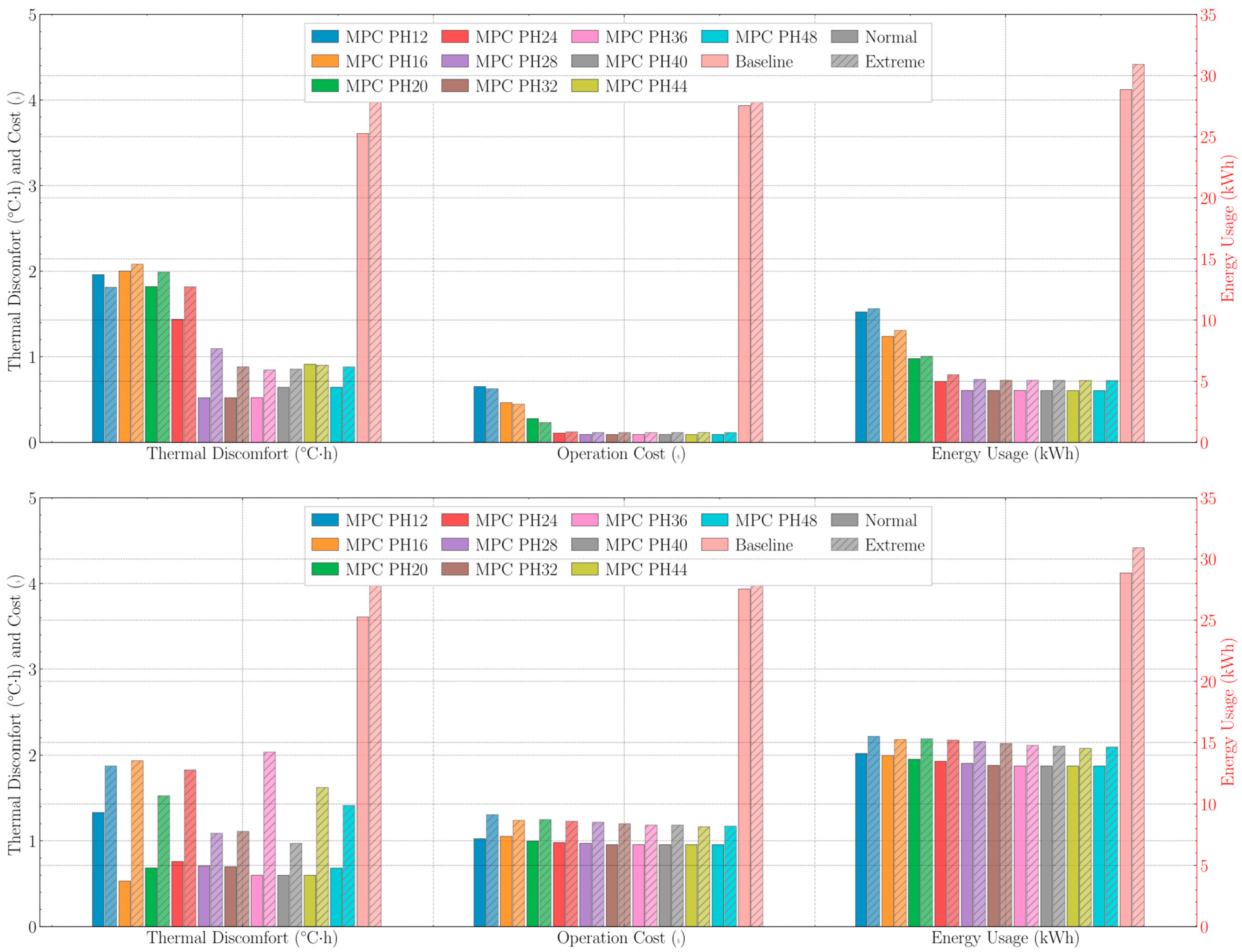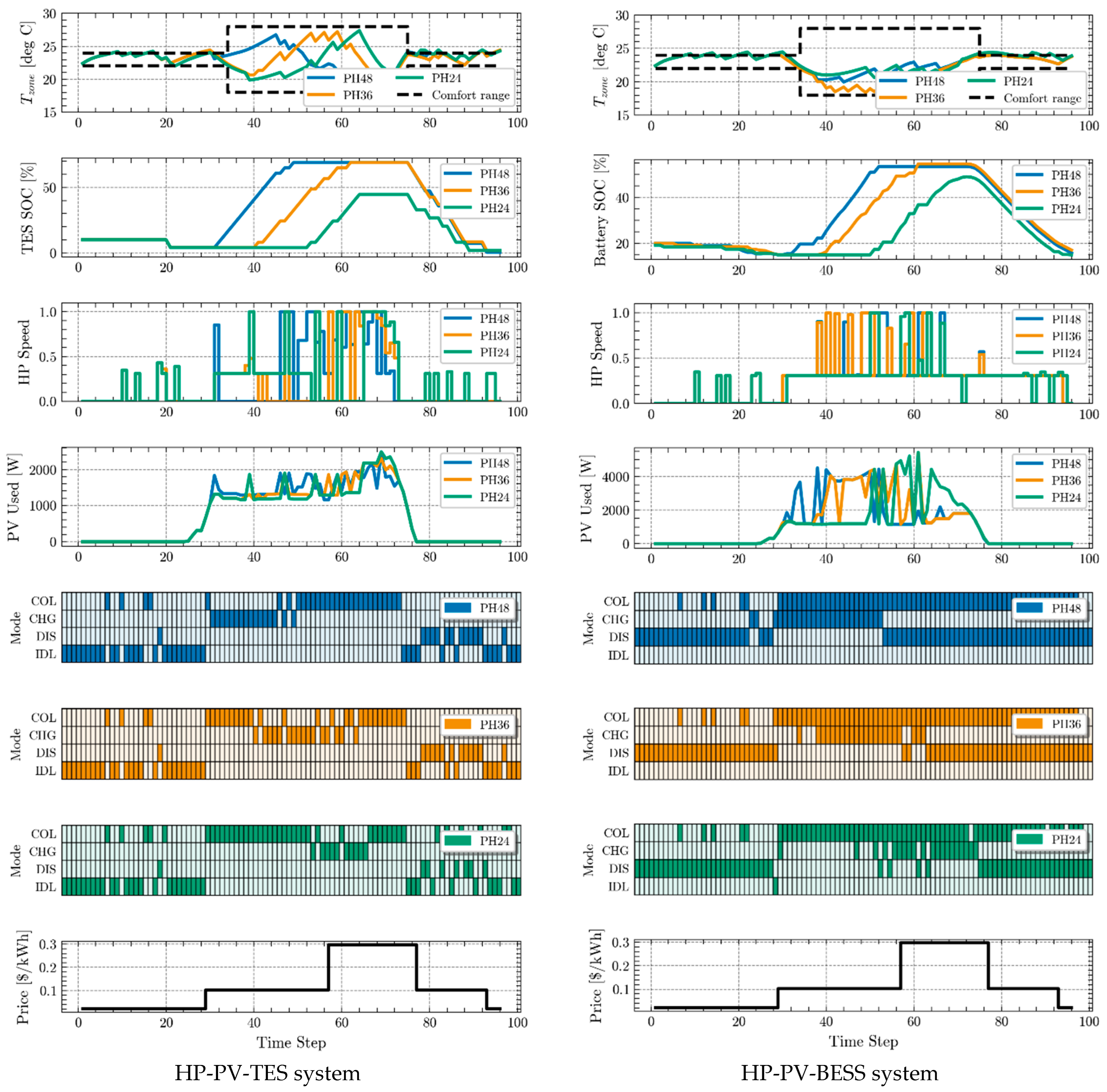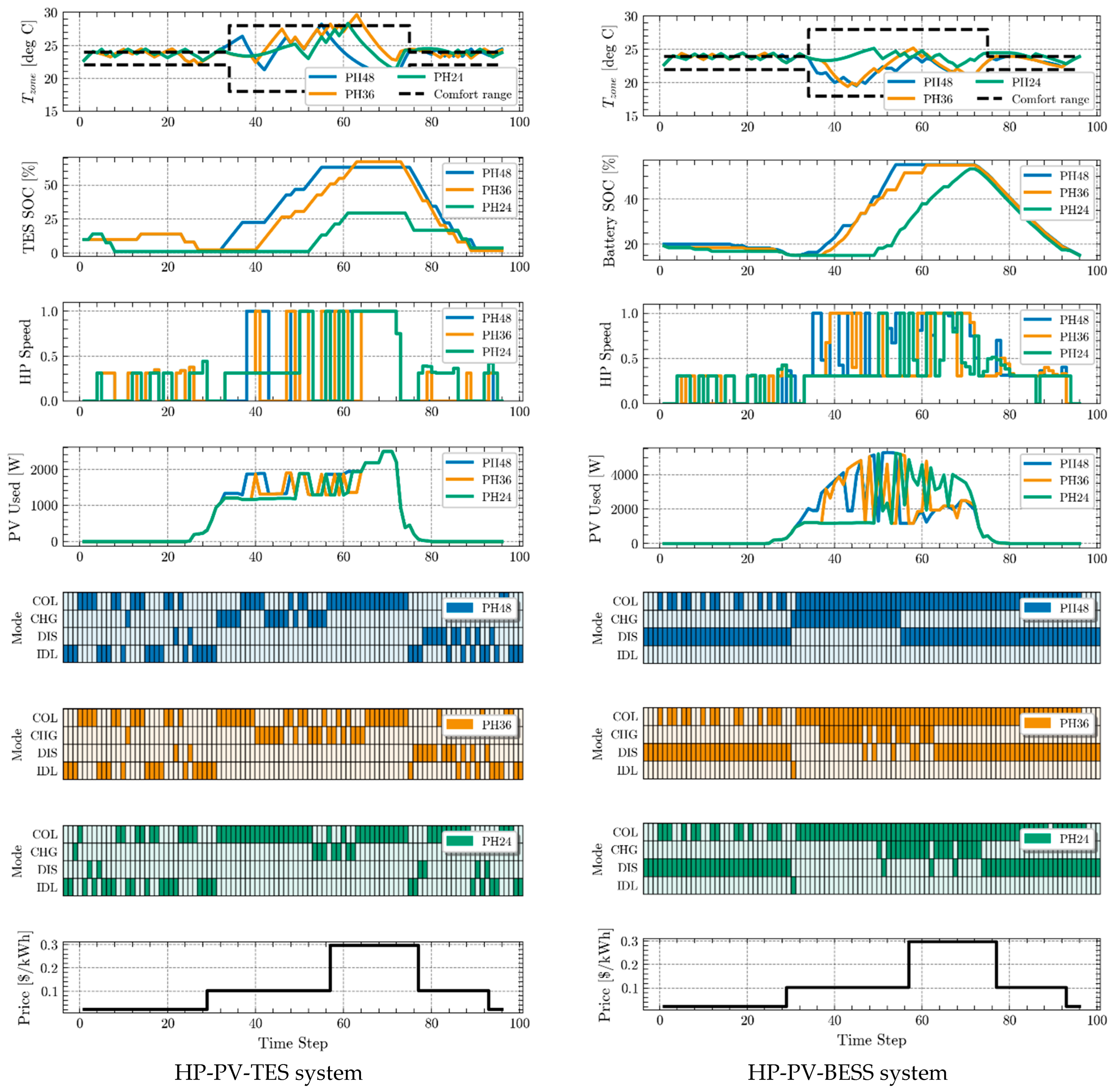 Figure 9. Simulation results of the two systems under three-stage electricity price using the MPC strategy for different pre-diction horizon lengths and extreme summer conditions.