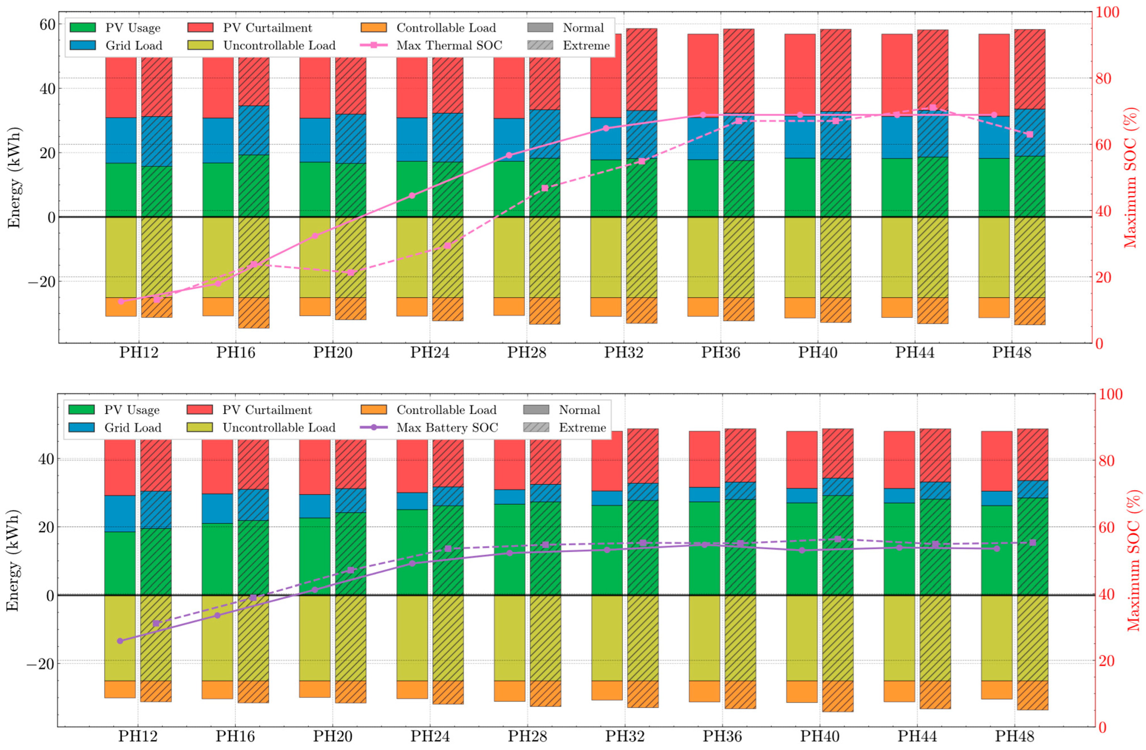 Figure 11. Comparison of energy flow and maximum storage utilization rate of two types of systems: HP-PV-TES (top) and HP-PV-BESS (bottom). The purple solid and dashed lines represent maximum storage utilization.