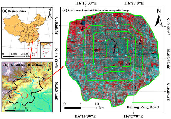 Beijing (39°56′ N, 116°20′ E) is situated in northern China along the northern margin of the North China Plain, bordering Tianjin Municipality to the east and surrounded by Hebei Province elsewhere [50]. As one of China’s most urbanized cities, Beijing exhibits distinct topography and a temperate-monsoon climate. The terrain descends from the northwestern highlands to the southeastern lowlands, with mountains encircling the western, northern, and northeastern sectors. The southeastern slopes transition into a broad alluvial plain extending toward the Bohai Sea. Climatically, summers are hot-humid and winters cold-dry, with abbreviated spring and autumn seasons. Rapid urbanization has intensified summer high-temperature events and amplified the UHI effect, positioning Beijing as an exemplary study area for evaluating UGS cooling efficacy. This research concentrates on the zone between the Inner City and Fifth Ring Road—encompassing Beijing’s primary transportation hub and core development corridor. This densely populated region plays a pivotal role in the city’s spatial-functional structure (study area location shown in Figure 1.