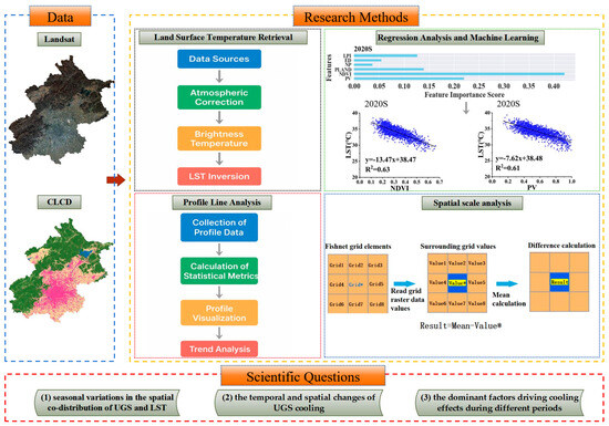 The technical workflow of this study is illustrated in Figure 2. Landsat-derived LST, Normalized Difference Vegetation Index (NDVI), and Percentage of Vegetation (PV) were integrated with CLCD land cover data. Regression analysis, machine learning, profile-based assessment, and multi-scale spatial analysis were employed to examine: (1) UGS spatial pattern evolution, (2) LST heterogeneity, and (3) spatiotemporal dynamics and drivers of UGS cooling effects.