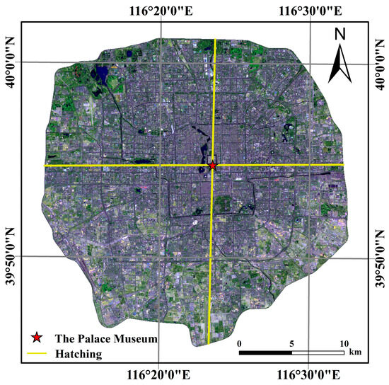 Profile-line analysis—a key spatial technique in urban thermal environment studies—elucidates temperature gradients across land cover transitions [52,53]. This method quantifies thermal variations from urban cores to peripheries or between green spaces and built-up areas. Reflecting Beijing’s axial-radial spatial structure, north–south and east–west transects were established centered on the Forbidden City. As Figure 3 illustrates, the east–west transect spans the Fifth Ring Road’s western to eastern extents, while the north–south transect connects its northern and southern boundaries.