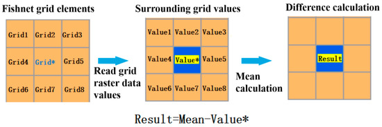 To rigorously characterize the spatial distribution of UGS cooling effects, this study implemented high-resolution spatial analysis. The study area was partitioned into 1 km × 1 km grid units, with thermal adjacency effects quantified for each cell relative to neighboring grids (Figure 4). Grid cells were statistically clustered based on cooling capacity. Comparative temporal analysis then assessed cooling intensity variations, while inter-period grid-level differences systematically revealed interannual evolution of UGS cooling effects.